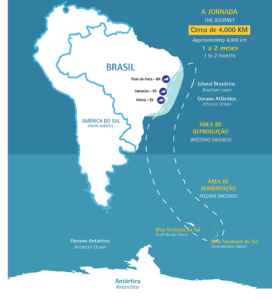 This figure shows the annual migration pattern of the humpback whale population that frequents the Bahian coast in the winter. (https://www.baleiajubarte.org.br/a-baleia-jubarte)
